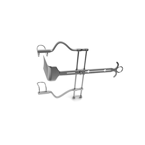 Collin Abdominal Retractor is an entire set that includes a frame and a pair of blades. These blades are outwardly curved at a right angle and are deep enough to retract thicker areas of the abdomen. In addition, the retractor contains ring handles and a spreader that has a maximum spread of 110.0 mm, which can keep larger incisions open.