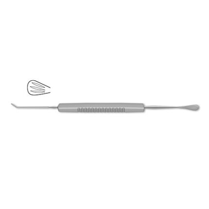 12.0 mm, 5-1/2" (14.0 cm)Wells Enucleation Spoon is a frequently used tool during extraction procedures. The spoon is designed to help ease the globe out of the orbit and to assist in visualizing the tendonous insertion of the ocular muscles for incision. The tool features an indentation to accommodate for the optic nerve and vessels.