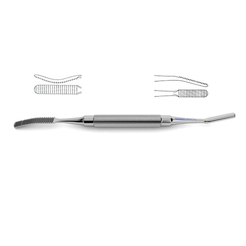 double ended, backwards cutting, 6-3/4" (17.1 cm)Â Nail and Bone Rasp is ideal for a number of different neurosurgical orthopedic type surgeries. This rasp is double ended making it a two in one and can quickly switch between thw two heads. It has the ability to be backwards cutting. This instrument features serrations that allow either end to be used to whittle down or smooth roughened surfaces. In craniotomies or spinal surgeries such jagged edges can cause tearing on delicate tissue such as brain tissue or individual nerves and vasculature.