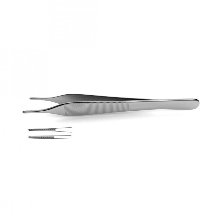 Adson-Micro Thumb Forceps are handcrafted from surgical grade German stainless steel with angled tips. Available in a variety of forms: for dressings with a serrated platform or for tissue with a serrated platform and 1x2 teeth. Each style is available with a serrated handle for a comfortable grip. This instrument is ideal for delicate tissues.
