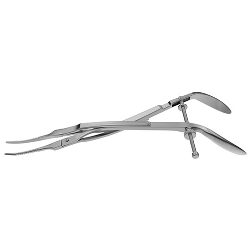 14" (35.5 cm) Barton Obstetrical Forceps are commonly used to aid in the delivery process when the fetal head is in the high transverse position, commonly seen during a cesarean delivery. The forceps feature a fixed posterior cephalic blade and a hinged anterior blade to firmly grasp the fetal head once locked. The blades are fenestrated to allow palpation by the surgeon and to provide minimal discomfort to the child's head.