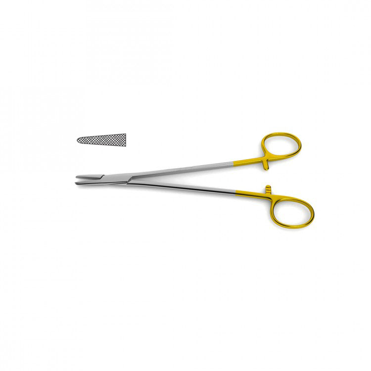 Mayo-Hegar Needle Holder is handcrafted from German stainless steel and tungsten carbide inserts that provides control, precision and a dependable non-slip crosshatched surface. The Mayo-Hegar is one of the most commonly used types of needle holders in operating rooms, and is offered in both right and left-handed variants and multiple lengths. The serrated jaws and gold-plated ratcheting handles are available in a variety of lengths as well as several left handed models. This instrument is protected by Ophthalmic Zone manufacturer warranty on defects in materials and workmanship. Tungsten carbide needle holders provide unparalleled control while suturing. The precision-milled, pyramid-shaped teeth ensure a dependable, non-slip surface. Some needle holder styles are also available with smooth tungsten carbide jaws, designed to hold the smallest sutures in microsurgical and plastic surgery procedures. Tungsten carbide jaws are inherently more durable than stainless steel and clinicians will experience an extended service-life. These needle holders feature gold-plated handles.