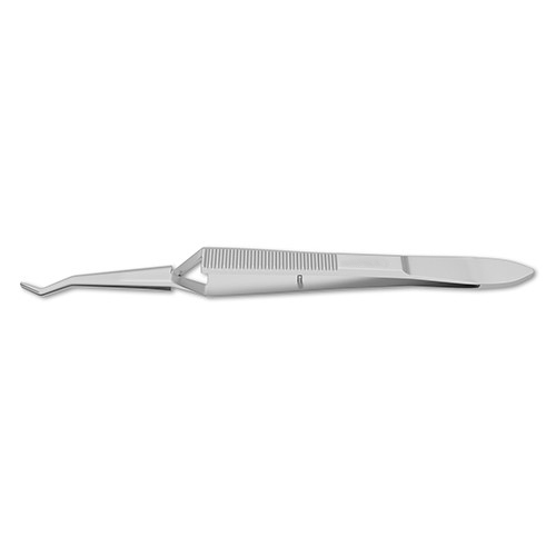 45 degree angle shafts, 7.0 mm from tip to bend, curved tips w/ 1×2 teeth, serrated cross-action handle, 3.8″ (9.7 cm)Â Rizzuti Superior Rectus Forceps are a commonly used tool for strabismus and muscle recession procedures. The forceps have a 10 mm tip designed to handle to full width of the muscle insertion. The tips also feature 1×2 teeth for a firm grip of the muscle without slippage. Finally, a serrated cross-action handle ensures the surgeon proper control during the procedure.