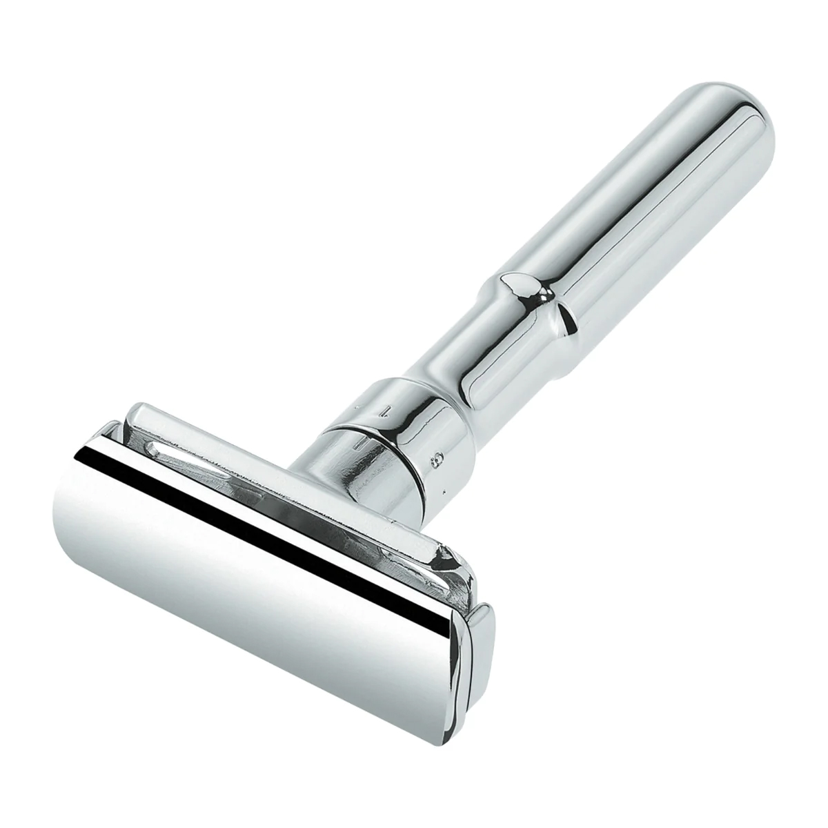 The GBI Future Double Edge Safety Razor allows you to adjust the angle of the blade inside the razor head to suit your personal preference and beard type. With the turn of a dial, the Future can be configured to perform the way you want it to – from ultra tame (1) to super aggressive (6). Solid and well constructed, the Future features a Duo Clip head that clips on and off when changing blades. Polished chrome finish. Also available in satin chrome or gold plated finish or as part of a set with matching brush and stand.