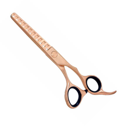 This is the 6.0″ 32 tooth Rose Gold Titanium Hair Thinning Scissors with an offset grip and the popular, secure