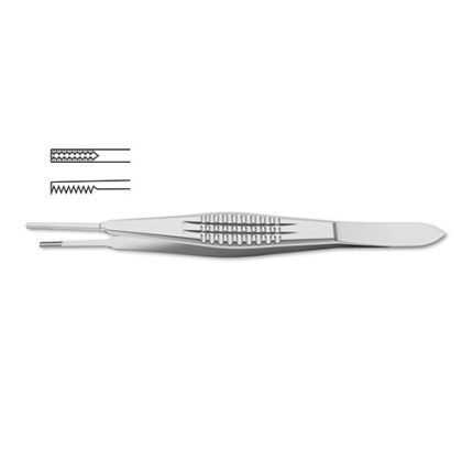 colibri style, 1x2 teeth, 45 degree angle, slightly overlapping, 3" (7.6 cm)Â Harms Corneal Utility Forcep is a specialized tool designed for handling corneal tissue during ophthalmologic procedures. The delicate 1x2 teeth provide a firm yet atraumatic grip to the delicate corneal epithelium during surgery or cornea-scleral suturing. The ribbed handle with finger hole allows the surgeon to adjust grip for maximum control.